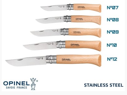 Stainless steel 12C27 Sandvik ได้รับการพัฒนาสำหรับ Opinel ที่มีชื่อเสียงสำหรับการรักษาคม ความง่ายในการลับและการดูแลรักษา การเพิ่มโครเมียมในจำนวนที่เหมาะสมจะทำให้เหล็กมีคุณสมบัติเป็น STAINLESS สำหรับ Opinel ที่ใบมีดเป็น STAINLESS STEEL จะทำจากเหล็ก 12C27 Modified (acier inox)